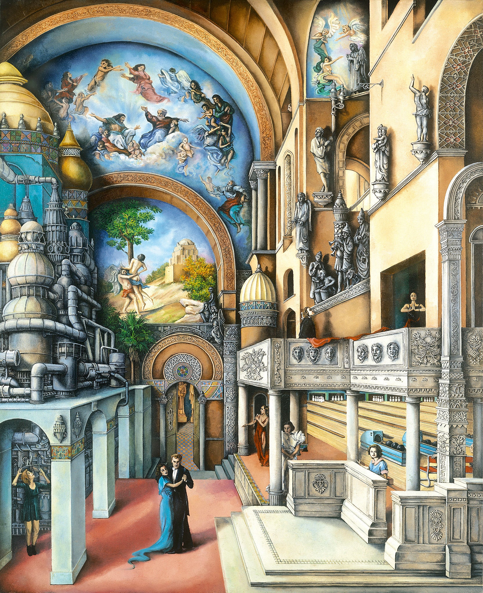 A couple, elegantly dressed dances the dance of lovers. A lone bride stands by the entrance to the bowling lanes, a woman in red belts out a tune. The setting is an opulent palace of sorts, its walls covered in frescoes displaying scenes from the Five Books of Moses. Biblical characters fill the heavens above while Jacob wrestles the angel in a lower arch. Statues fill the recesses and balconies. On the other side of the hall pipes, turbines, and the steel of machines act as a more industrial concept of utilitarian beauty.