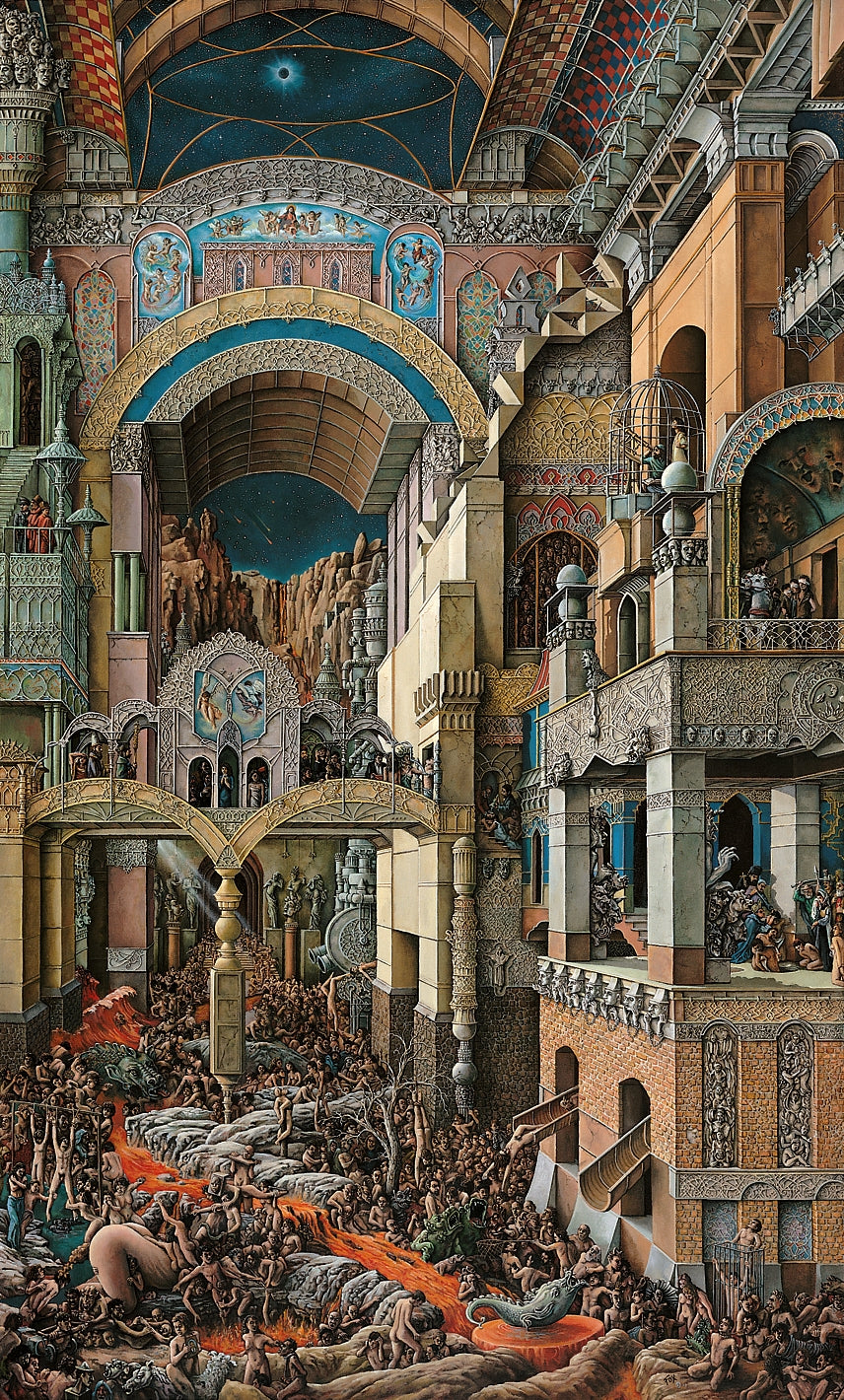 One early evening, when I was working on this painting, I become aware of my six-year old son standing next to me, and watching me produce the ghastly characters in the work. He put his arms around me and give me a kiss.