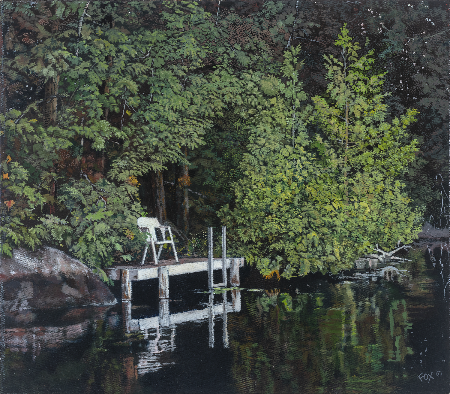 From the first moment I set eyes on the lone chair, on a simple dock at the end of the island, I knew I had to paint it. This was certainly what the idyllic and utopian look and feel like. My son and I edged the canoe up to the dock and took a walk about the island, following a path that skirted the shoreline.
